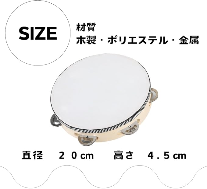 【商品内容】タンバリン 1個、本体サイズ:直径20cm、高さ4.5cm、材質:木材、ポリエステル、金属 対象年齢:6歳以上 ※サイズ詳細は商品画像をご確認ください。