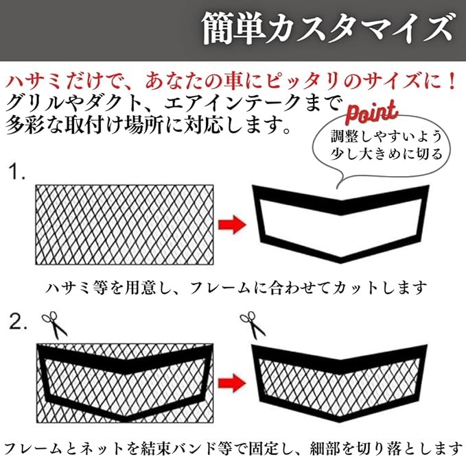 【簡単カスタマイズ】ハサミだけで、あなたの車にピッタリのサイズに調整可能。グリルやダクト、エアインテークまで、多彩な取付け場所に対応します。