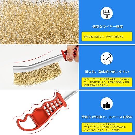 【高効率で使いやすい】ワイヤーブラシはアーク構造を採用し、力を入れやすく、プラスチックハンドルは全長10 cmで、手触りが快適で、長時間作業しても、手の疲れを軽減し、作業効率を高めることができる。プラスチックハンドルの端には小さな穴があり、ぶら下げることができ、スペースを節約。