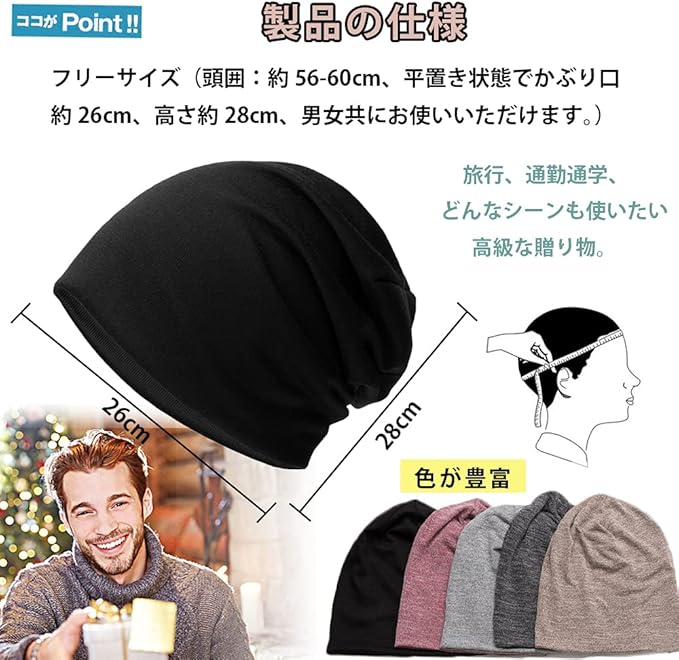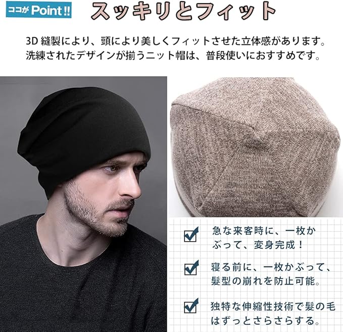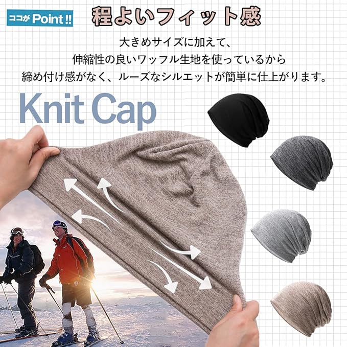 【伸縮性あり】伸縮性に優れた素材採用し、頭にフィットしてゆったりかぶれます。頭の大きさ関係なしに被ることができます。伸縮性に優れた素材を使用して、締め付け感がなく、型崩れもしなくて、頭にフィットしてゆったりかぶれます。