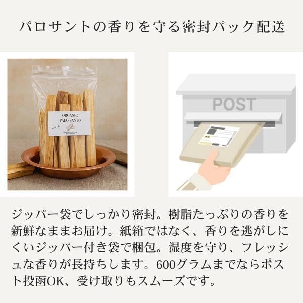 当社では、一度に大量仕入れをするのではなく、月に一度の頻度で残りの在庫を確認し、必要に応じてペルーから仕入れを行っています。この取り組みにより、常に香り高くフレッシュなパロサントをお届けすることが可能になりました。お客様がいつでも最高品質のパロサントをお楽しみいただけるよう努めています。