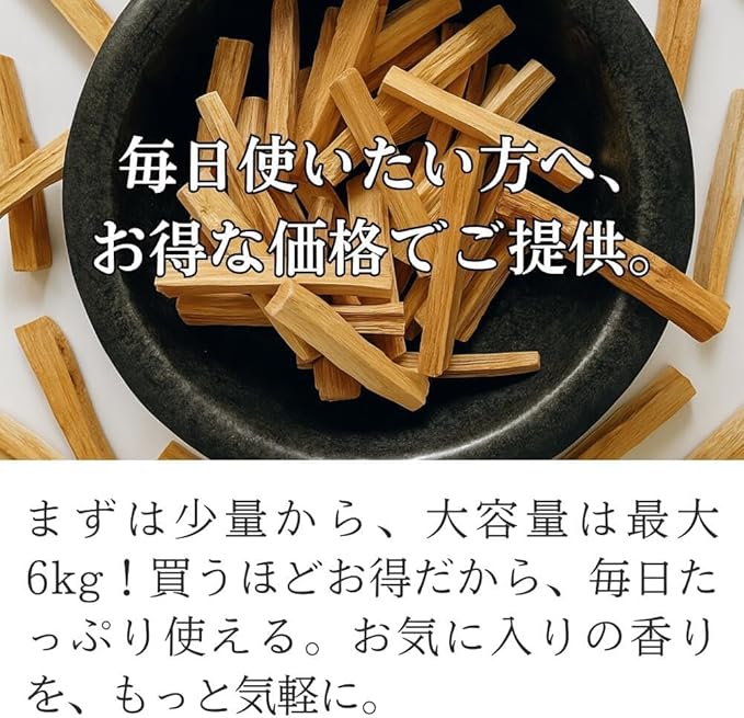 製品の加工においては、シンプルさを重視しています。ロゴやパッケージ、スティック表面の焼印など、製品の品質に直接関係しない要素は省きました。このアプローチにより、コストを抑えつつ、お客様に安価で高品質なパロサントをご提供しています。