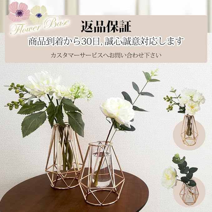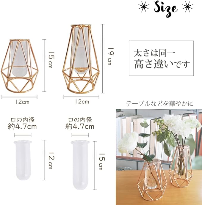◆花瓶サイズ :■ワイヤー部 19cm(大) / 15cm(小) ■ガラス部 長さ 15cm(大) / 12cm(小) 口径(内径) 約4.7cm