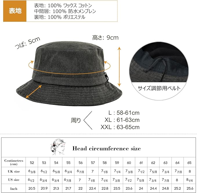Lサイズは頭囲58-61cm、XLサイズは61-63cm、XXLサイズは63-65cmにフィットします。内側のタイストリングでサイズ調整が可能です。取り外し・調節可能なチンストラップで、風が強い日や雨風の中でも帽子が飛ばされる心配はありません。