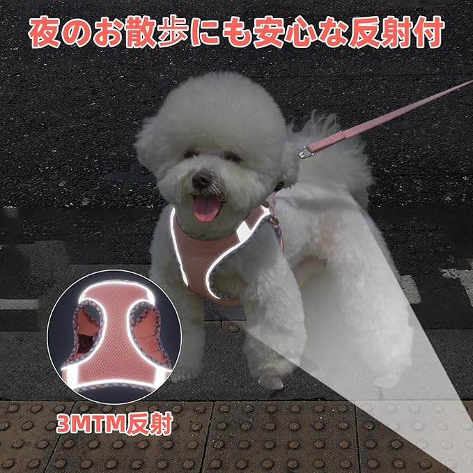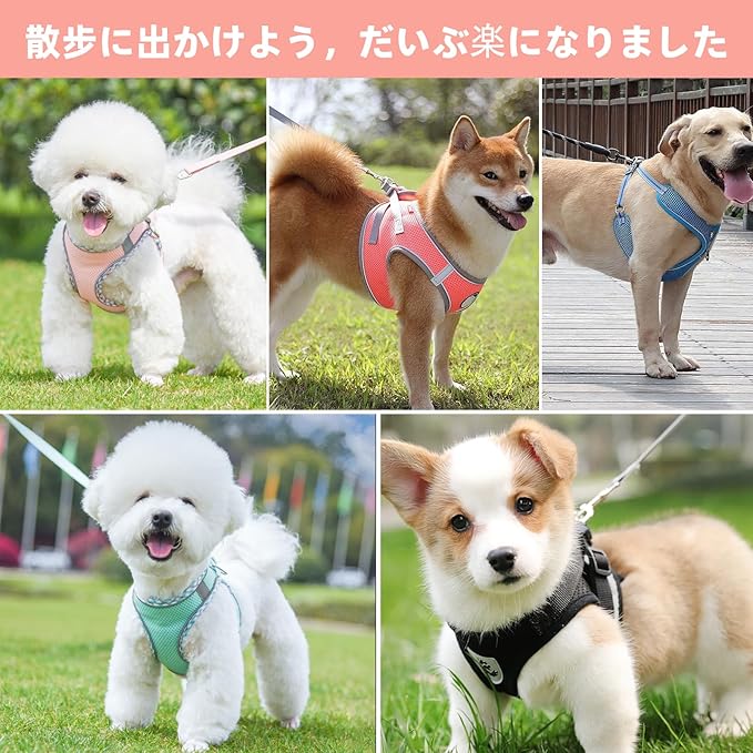 「快適な着け心地」:通気性が良くソフトな肌触りのメッシュ素材を使用。胸部に通気性とクッション性のある生地を使用しているので、愛犬にかかる負担が少ない。毎回の調節が不要のワンタッチバックルを採用しているので、簡単に装着できます。同時に,胴周りはバックルベルトとマジックテープでサイズ調整可能。どんな犬にもぴったりの首輪デザイン,ストレスフリーのハーネスリードセットを実現しました。