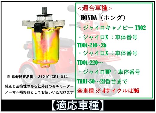 ✅ HONDA 用 ジャイロキャノピー、ジャイロ-X 、ジャイロ-UP 社外品 の オートバイ 用 セルモーター 純正 タイプ 社外品 です。