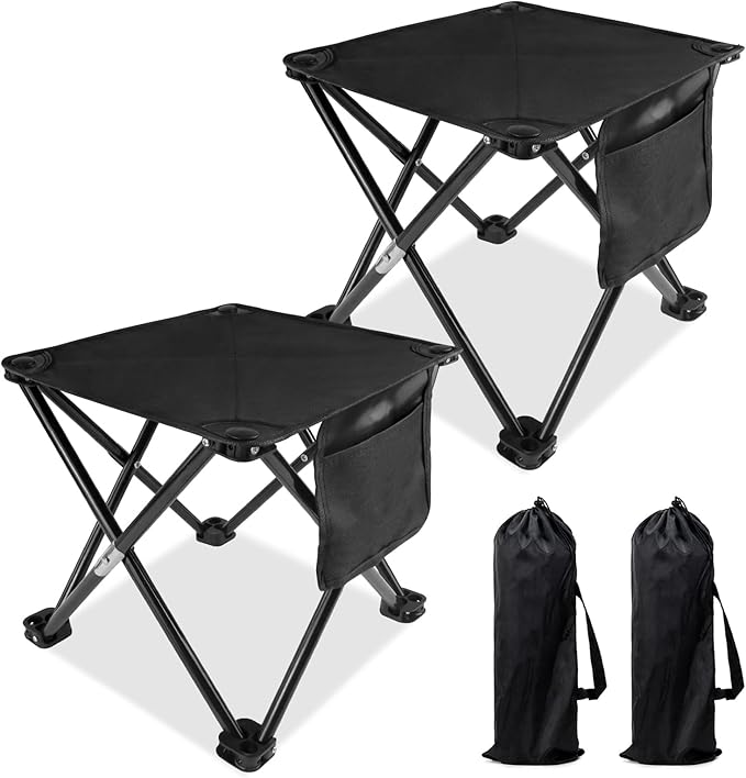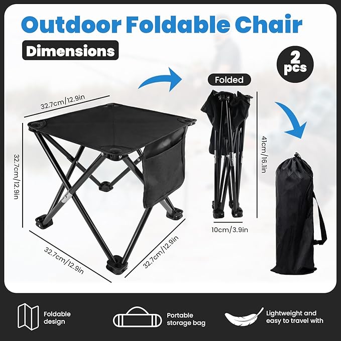 【軽量&ポータブル】重量はわずか1.5ポンド、折りたたみ時の寸法は3.9インチ x 16.1インチで、2つの黒いキャンプスツールは簡単に折りたたんで持ち運びできます。キャリーバッグ2つ付き。 どこに行っても休憩場所を提供します。