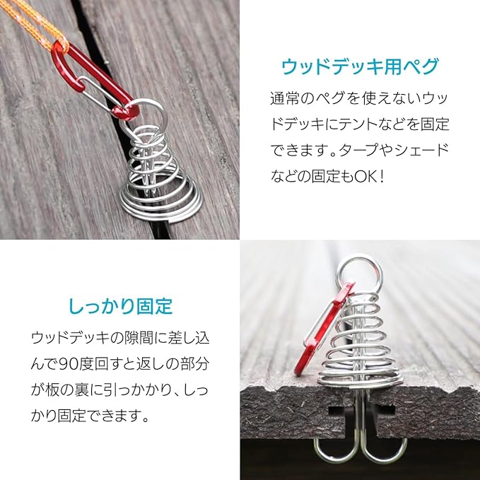 ひっかけて使えるウッドデッキ用のアンカーペグです。通常のペグを使えないウッドデッキでもテントなどを固定できます。タープやシェードなどの固定にもご利用いただけます。