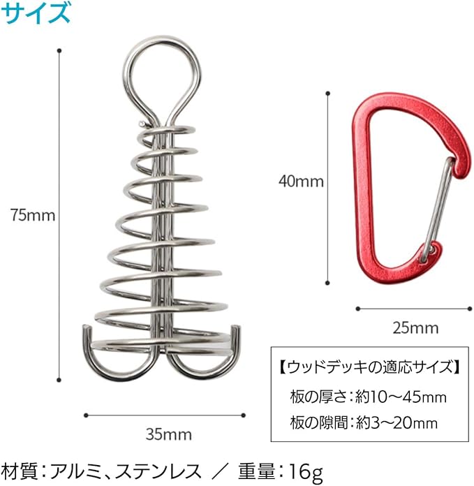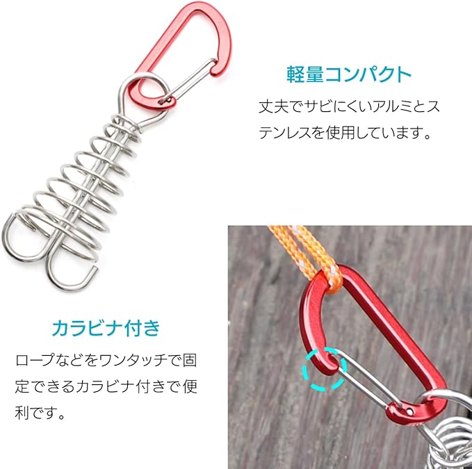 1個約16gの超軽量コンパクトサイズです。丈夫でサビにくいアルミとステンレスを使用しています。