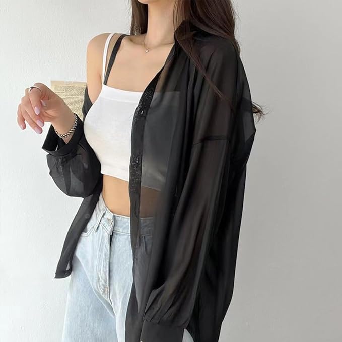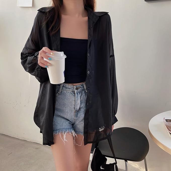 【着回し力抜群・重ね着】:シンプルながらも着回し力抜群の透け感シャツです。パンツともスカートとも合わせやすくて、ワンピースやチュニック、トップス、キャミソールなどの上にも一枚さらりと気軽に羽織えます。通勤や通学などに最適で、もちろんお出かけ・デート・旅行などにもぴったりして、またパーティーやクラブなどの場でも活躍できます。
