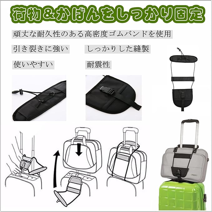 【調整可能】ベルトは調節可能で、大きいサイズのバッグでもしっかりと結びつけます。弾力が強い伸縮性ので、荷物が落ちにくいです。