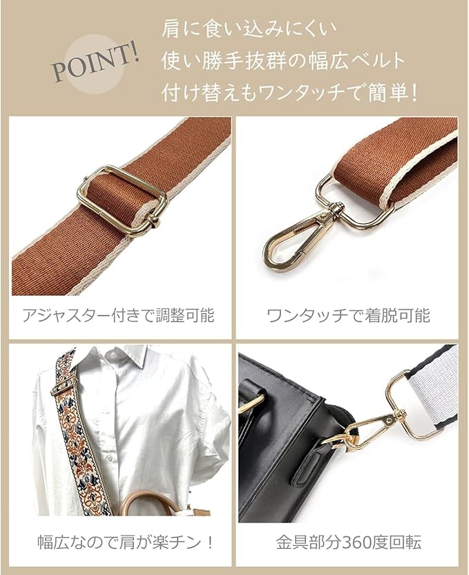 【長さ調節可能!】長めにして斜め掛けにも、短くして肩掛けにも 75cm~130cmまで調整できます。お手持ちのバッグのベルトを付け替えるだけでオリジナルデザインのバッグに!