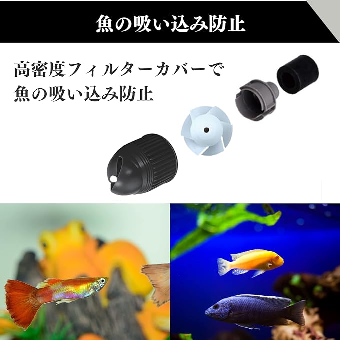 【魚の吸い込み防止】高密度フィルターカバーにより、魚の吸引を防止します。マルチアングル回転調整で水流の向きを自由自在に調整可能。