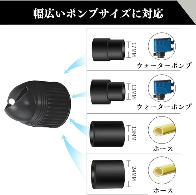 【幅広いポンプサイズに対応】さまざまなウォーターポンプやホースにスムーズに接続できます。また、接続用ジョイント4種が付属しているため、異なるパイプの直径に対応し、使用する環境やニーズに合わせて調整することができます。