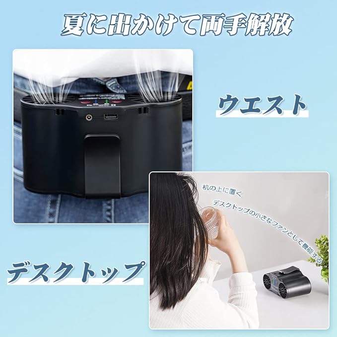 一台2役:ベルトフックで扇風機をベルトに引っ掛けるだけ簡単に装着ができました。卓上用のスタンドを開け、卓上扇風機として使用することもできます。また、ワークマンなどのエアコン服(ファン付き作業着)とは異なり、使用する服を選ばず、小型で持ち運びやすくいつでもどこでも暑い時期には快適に過ごせます