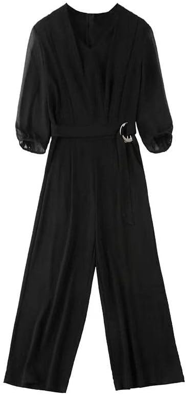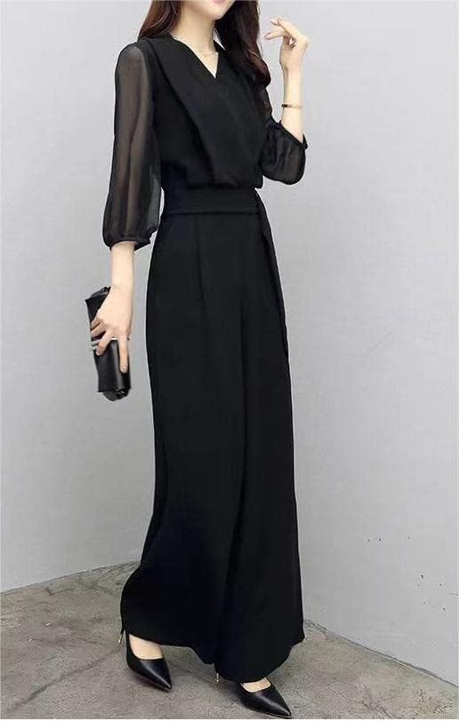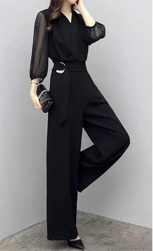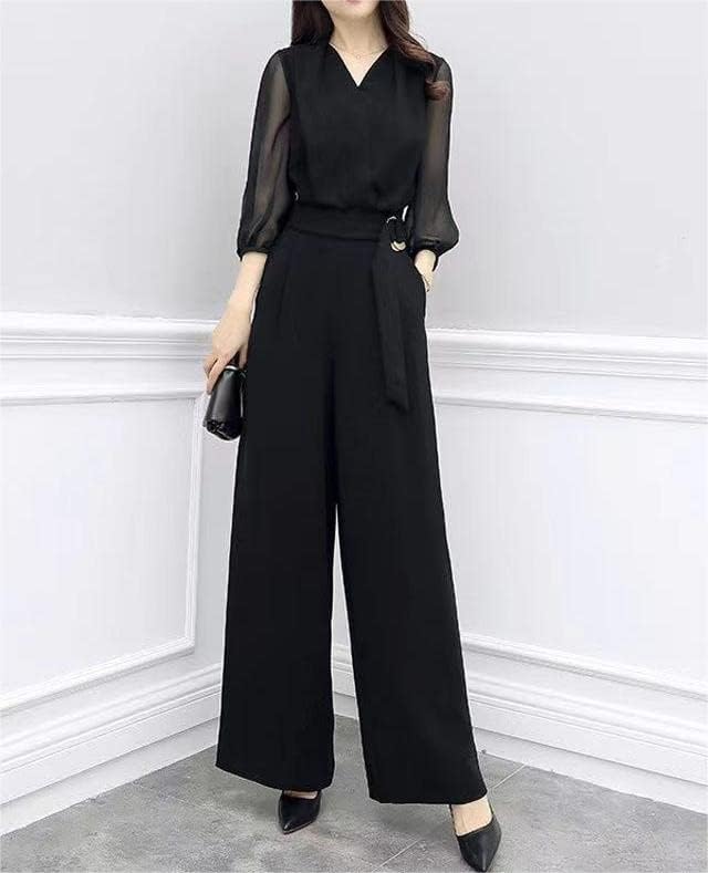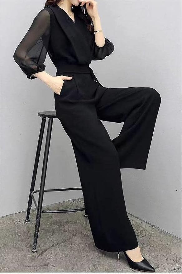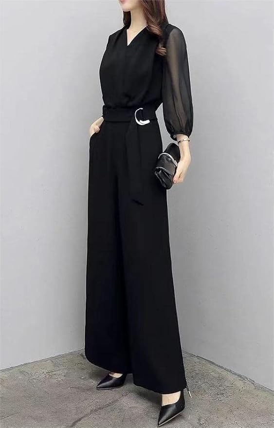 Vネックが顔をスッキリ見せ、歩く度に摇れる裾が女性らしさをに醸し出します袖はシースルーシフォンレース切替から腕が見えるので重すぎないのが特徴。脚を優雅に見せてくれる、締め付け感も無く着心地が良いなワイドパンツドレス。