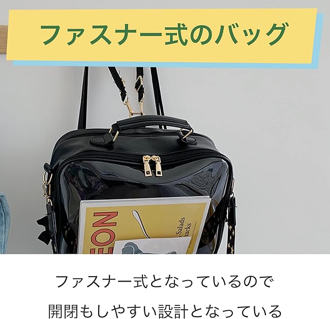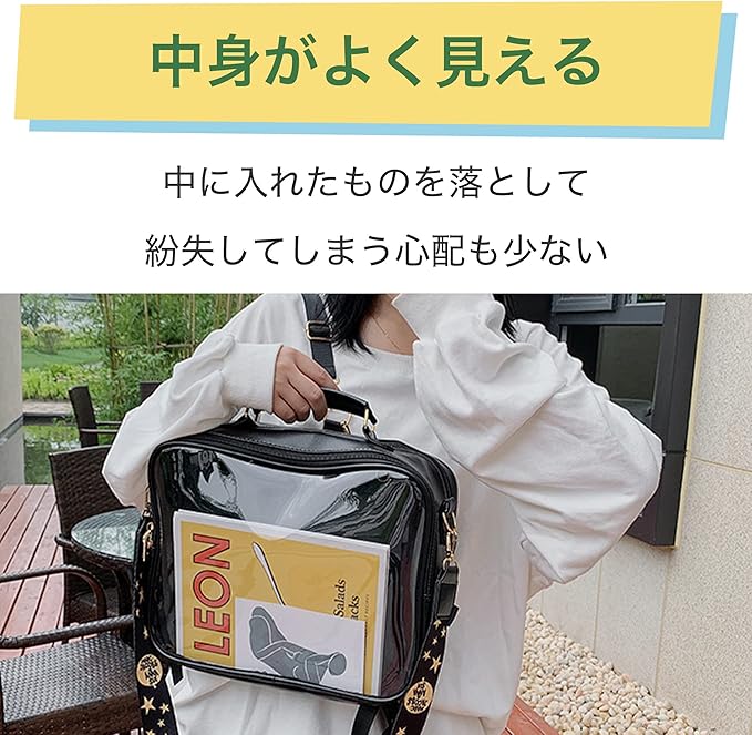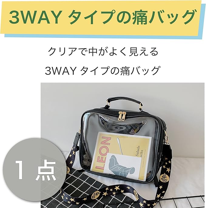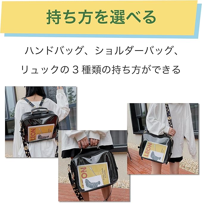 3WAYタイプの痛バッグ:クリアで中がよく見える3WAYタイプの痛バッグです。大好きなキャラクターやアイドルのグッズを中に入れて、自分だけの痛バッグにすることができます。