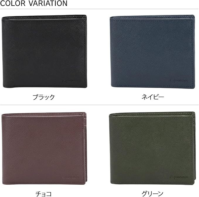 こちらはオーソドックスな型押しの革を使用しています。弾力性に富んだこの革は、丈夫でキズが付きにくく、型崩れしにくい特性があります。シンプルな二つ折り財布小銭入れありタイプです。カード収納はカード段が4つに、フリーポケットが3つあり、スリムながら、収納スペースが多く使い勝手のいいお財布です。