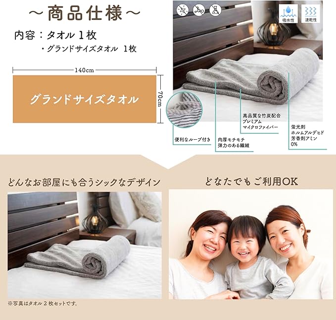 ✅【内容:竹炭配合タオル1枚】グランドサイズタオル(70cm 140cm)1枚 【素材】竹炭マイクロファイバー(ポリエステル90%、ナイロン10%) 【カラー】グレー/グレーストライプ いずれかをお選びいただけます。