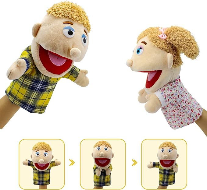 創造性と想像力を育む: Family puppets are great for bedtime play, role play, teaching, and stage play, puppets help development motor skill, hand eye coordination, communication skles, confidence, and social-emotional connection, which is great for common to share you can put your hand in the mouth or arm of the puppet, the big mouth is very eye-design of the big mouth is very eye-キャッチング、そしてそれ ステージパペットパフォーマンス中、より鮮やかになります!