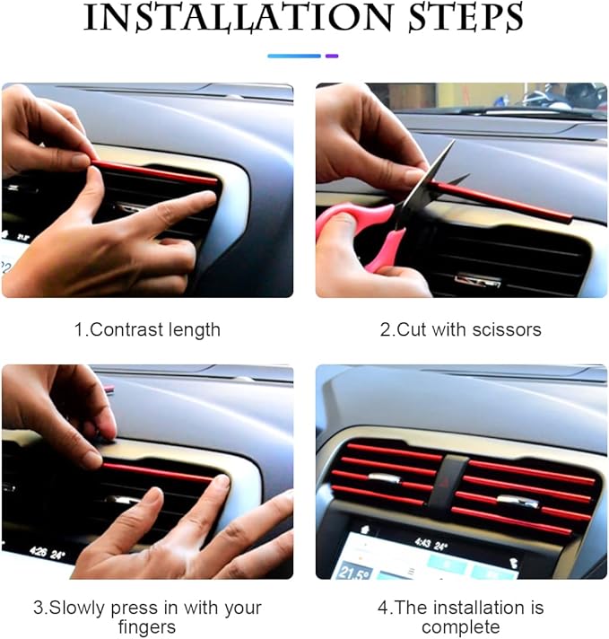 [使いやすい] 長さ7.6インチ。 特別な工具を使わず、数分で簡単に取り付けられます。 まず、装飾したい表面をきれいにし、長さを測定して比較し、はさみを使って通気口コンセントのマッチした長さをカットし、ストリップを開いて通気口に設置する必要があります。 取り外しや交換も簡単です。