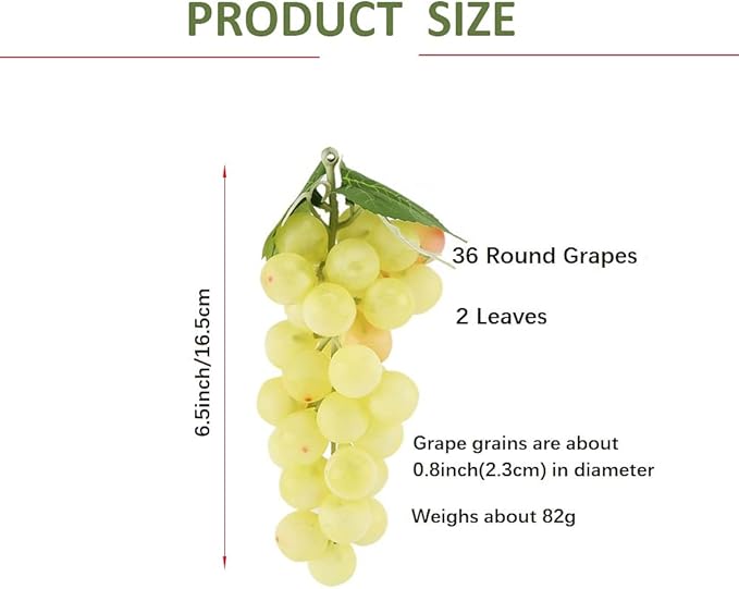 寸法:本物の果物と同じ外観の高度なシミュレーションブドウ。 合計5本のブドウ、各ストリングには36個のブドウ、ブドウのストリングサイズ:6.5インチ、ブドウのサイズ:0.8インチ。