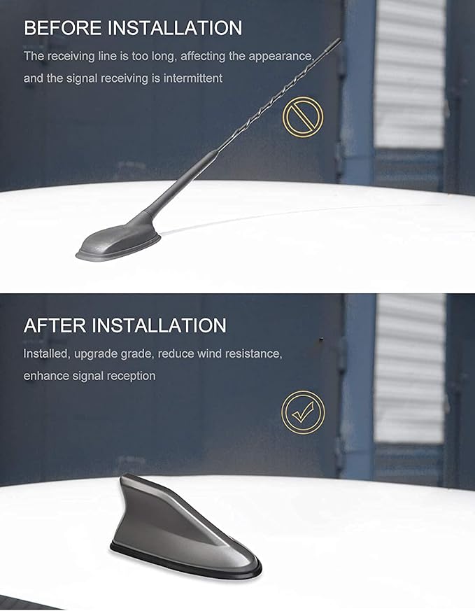 ★取り付け方:?取り付ける箇所の汚れを落とします。 ?付属のネジでアンテナ線を取り付けます。 ?両面テープを剥がしアンテナ台に被せます。 ?位置を確認したら、しっかりと押さえつけて完成です。 ※取り付けした後、24時間は洗車をお控えください。