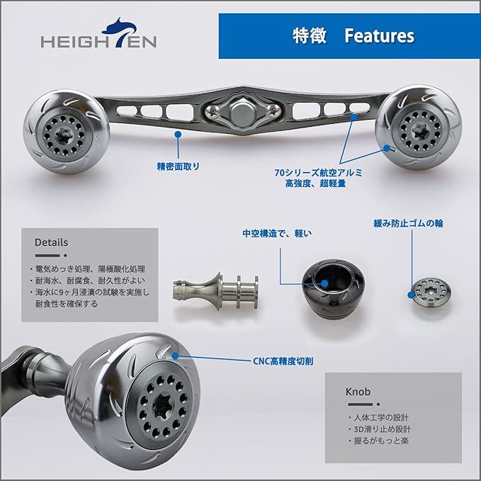 【商品特性】:綺麗な外観、高性能素材、CNC精密加工技術,丈夫で軽い、耐海水、耐腐食、錆付かない、耐久性、安定回転、滑り止め設計、キャップ緩み止め設計、コントロール性能上がり、人体工学設計で疲れない。