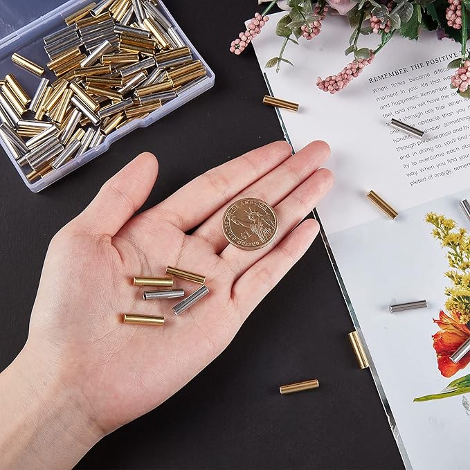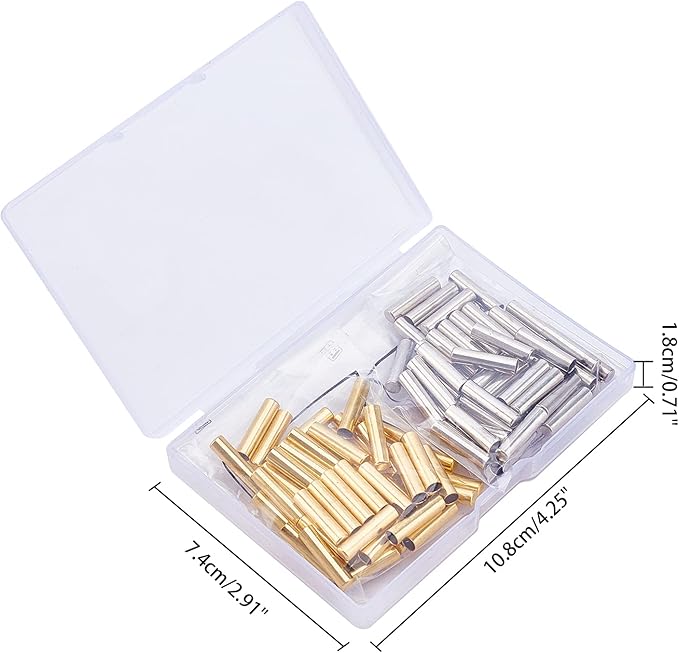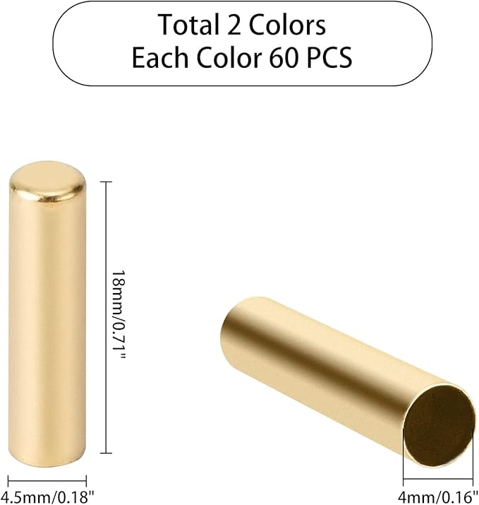 お得のセット:2色の各色に60個ずつの計120個の大容量の紐先金具キットです。収納ケースも付属されています。カラー:金/ゴールド、銀/シルバー。サイズ:長さ18mm、幅4.5mm、穴:4mm。