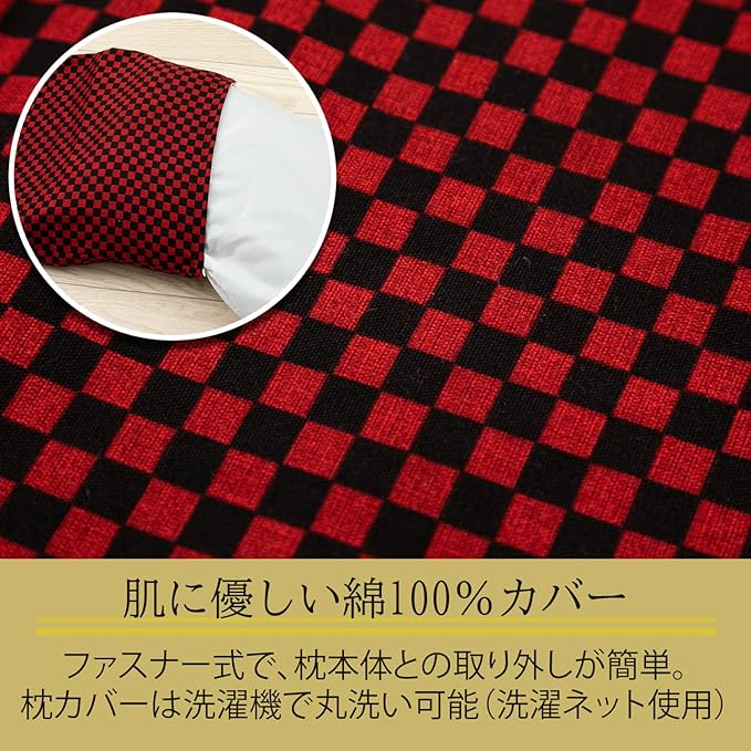 付属の枕カバーは市松模様をプリント。市松模様は、その柄が途切れることなく続いて行くことから、繁栄の意味が込められており、子孫繁栄や事業拡大など縁起の良い模様として沢山の人に好まれています。素材は肌に優しい綿100%。吸水性、吸湿性に優れています。ファスナー式で、枕本体との取り外しが簡単。枕カバーのみご家庭の洗濯機で洗濯できます(洗濯ネット使用)。※枕本体は洗えません。