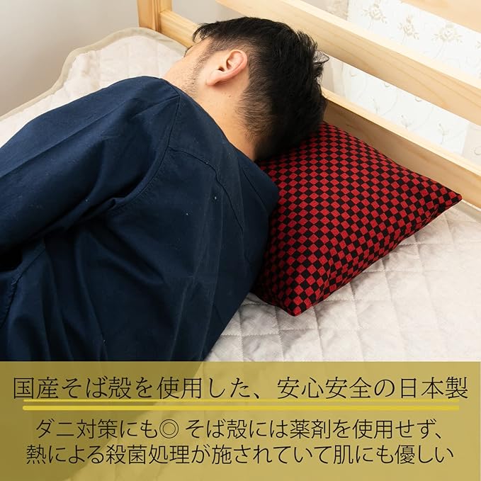 国産のそばがらを使用した、安心安全の日本製。簡単に着脱できる専用カバー付。枕カバーは 洗えるので清潔に衛生的にお使いいただけます。 ダニ対策にも◎