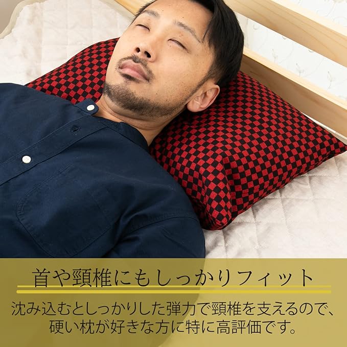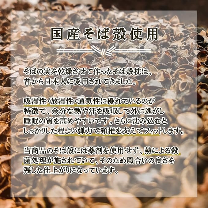 中材のそば殻には薬剤を使用せず、熱による処理が施されていて、そのため風合いの良さを残した仕上がりになっています。昔ながらの蕎麦殻ピローはしっかりとした高めの安眠まくらです。首や頸椎にもしっかりフィット。
