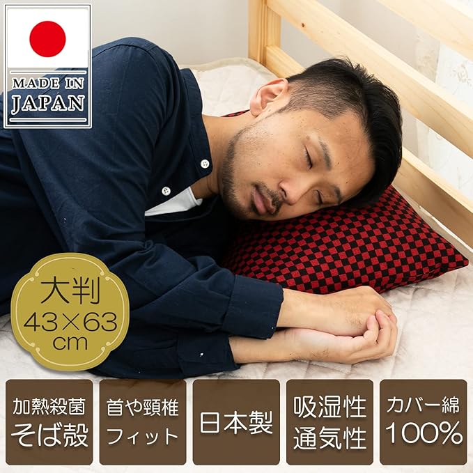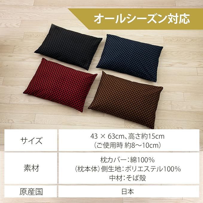 【サイズ】43 63cm【素材】枕カバー:綿100% (枕本体)側生地:ポリエステル100% 中材:そば殻【原産国】日本