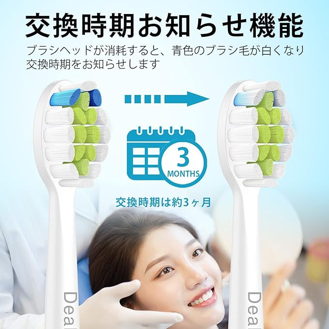 交換時期お知らせ機能:ブラシヘッドが消耗すると、青色のブラシ毛が白くなり交換時期をお知らせします。※交換時期は約3ヵ月です。