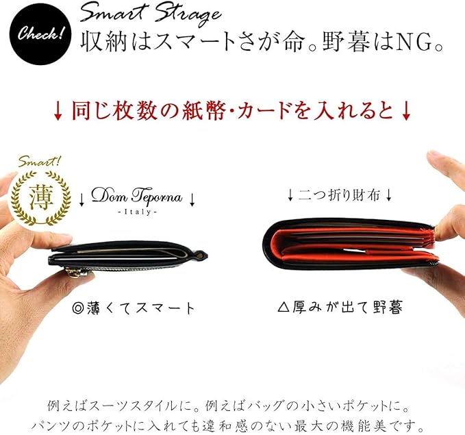 [スペック] ・お札入れ 1 ・小銭入れ 1 ・カードポケット 6 [推奨収納] ・一万円札 10-15枚 ・カード 6-8枚 ・コイン 15-20枚