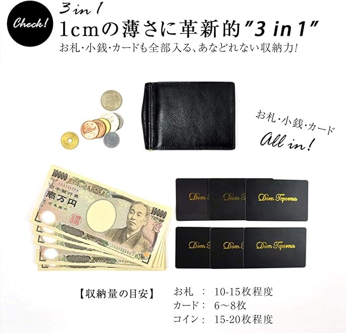 極薄 本革 マネークリップ 収納はスマートさが命。野暮はNG 。 全てがこの一つに 「お札」「小銭」「カード」全てを収納 "1cm"の薄さに革新的"3 in 1"