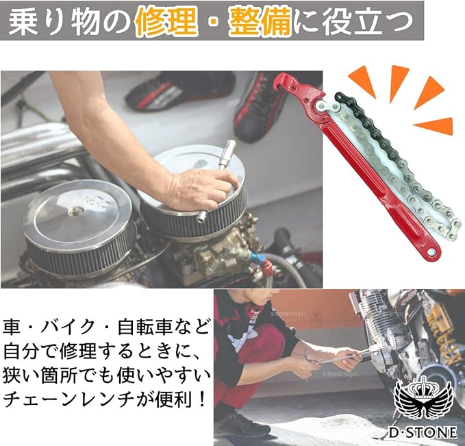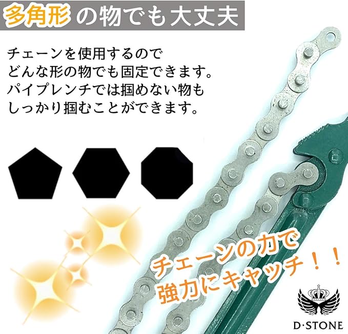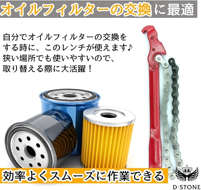 チェーンの力を利用するチェーン レンチは、様々なサイズに対応で き、オイルフィルターの交換だけ でなく三角、四角の多角形など幅 広い形に使用できます。バイク、 自動車の修理用の工具の必需品で す!