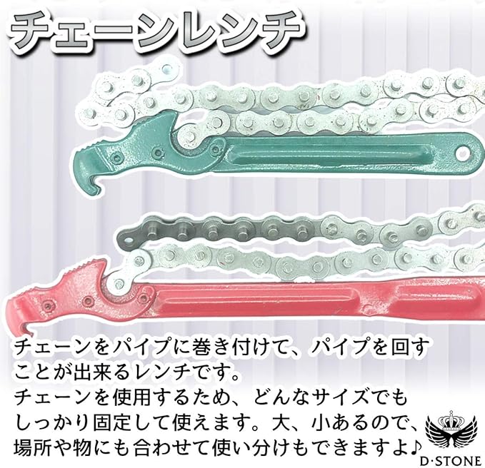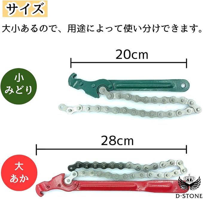 【バリエーション内容】チェーンレンチ サイズ1個。①ハンド ル長さ:20cm、チェーン長さ: 42cm、カラー:緑②ハンドル長 さ:28cm、チェーン長さ:45cm 、カラー:赤※モニターの環境に より、色の見え方に若干差が生じ る場合がございます。