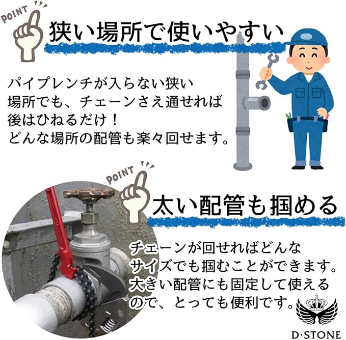 パイプレンチが使えないような 狭い場所の配管作業もチェーン レンチがあれば簡単に。様々な サイズに対応でき、チェーンが 強力に食い込み大きな力を発揮 します。