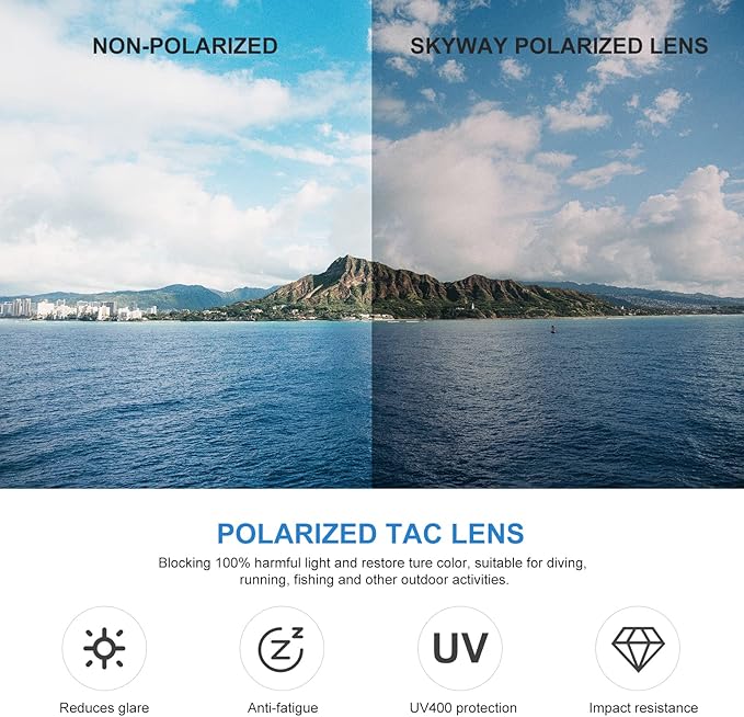 【HD偏光レンズ】- SKYWAY偏光サングラスは、UV400保護コーティングで有害なUVAとUVB波を100%ブロックします。 実際の色を視覚的に復元し、反射光や散乱光を排除します。 TAC偏光レンズは、衝撃や傷に強く、軽量で耐久性があります。