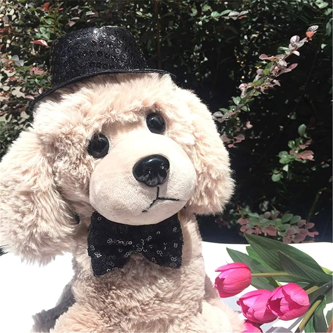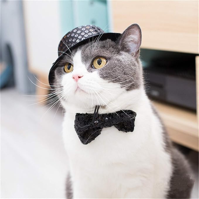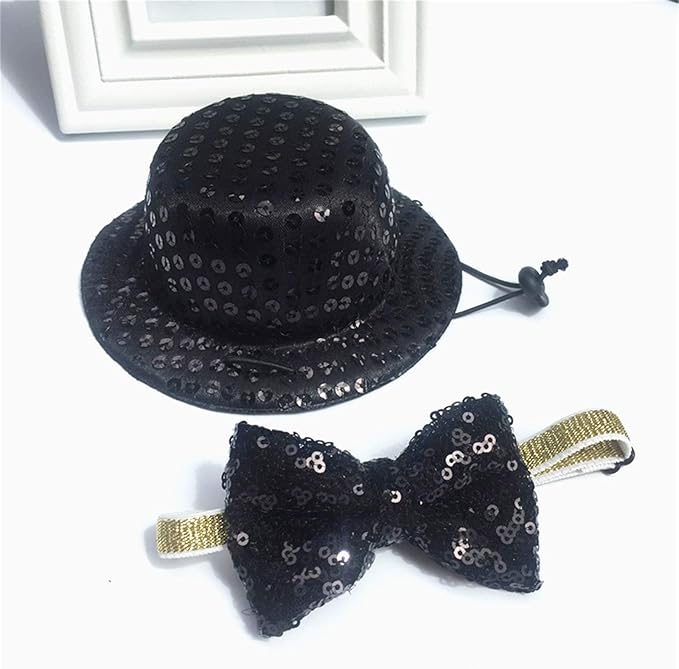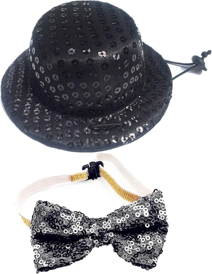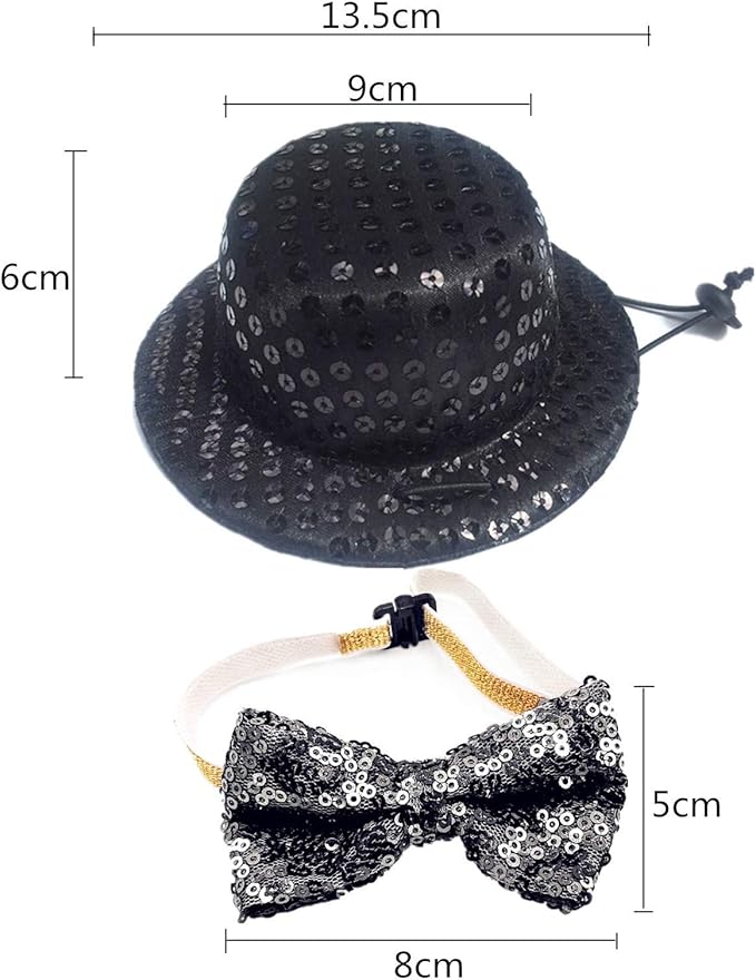 シンプルで高級感があるペット用ハットと蝶ネクタイのセットです。黒の生地にスパンコールがデザインされています。サイズは調整可能なので、快適に着用できます。