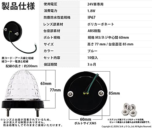 ■仕様DC24V車専用[HV車対応] ■サイズ全長:77mm/直径:85mm 2個入り&10個入りも有り 全4色「ホワイト、イエロー、レッド、ブルー」「ピカキュウ サイドマーカー」で検索!