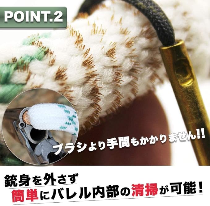 【掃除が簡単♪】ヒモを薬室側から通して口側へ引き抜くだけで、簡単にバレル内部の清掃が可能です。身を外さずに内部の清掃ができますので、ブラシより手間もかからず、汚れをピカピカに拭き取ってくれます。