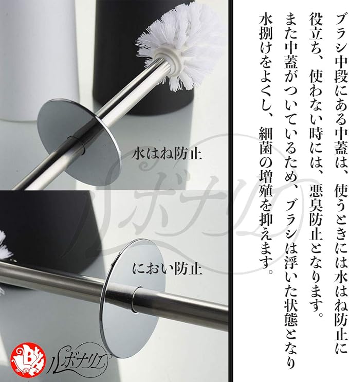 ブラシ中段にある中蓋は、使うときには水はね防止に役立ち、使わない時には、悪臭防止となります。また中蓋がついているため、ブラシは浮いた状態となり、水捌けをよくし、細菌の増殖を抑えます。