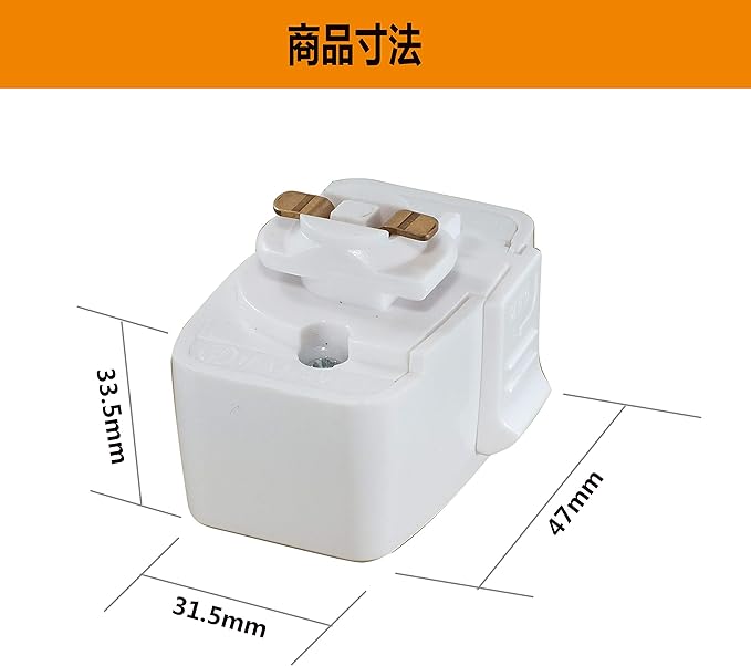 4.サイズ:高さ33.5mm 幅31.7mm 全長47mm。材質:プラスチック+銅、重量:33g/1個、色:白い(ミルクホワイト)、適合負荷: 15A 125V 50/60Hz専用まで、包装:6個入り.