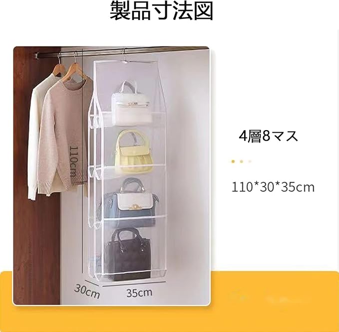 鞄 収納 製品仕様:吊り下げ収納 バッグ 収納 4段展開 サイズ:約35x30x110cm、両面4段式で、合計ポケット8個収納可能です!バッグや旅行用ポーチなどの整理整頓に大活躍です。バッグだけでなく小物等も入れられる万能型です。Tシャツ、タオル、帽子などの物にも適用です。