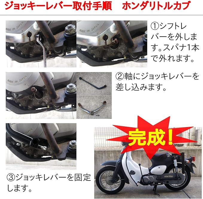 クラッチのある車種ですと、クラッチレバーの移設が必要になってきます。 ですがカブなどクラッチレス(遠心クラッチ)の車種ならば面倒な移設作業が不要で、 簡単にジョッキーレバーのカスタムを楽しむことが可能です。 カブの場合、左足で操作するシフトレバーを外して、こちらのレバーを装着するだけの簡単取付。 取付、取り外しは六角レンチ1本で済ます。