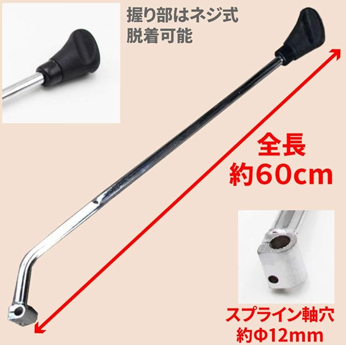 【サイズ】全長:約600mm 接続部スプライン径:約12mm 【材質】本体:スチール グリップ部:樹脂 車種によって、ジョッキーレバーについている固定ボルトがエンジン、 ミッション等と干渉する場合がありますので、その際は短めのボルトに交換する 等加工が必要になる場合があります。