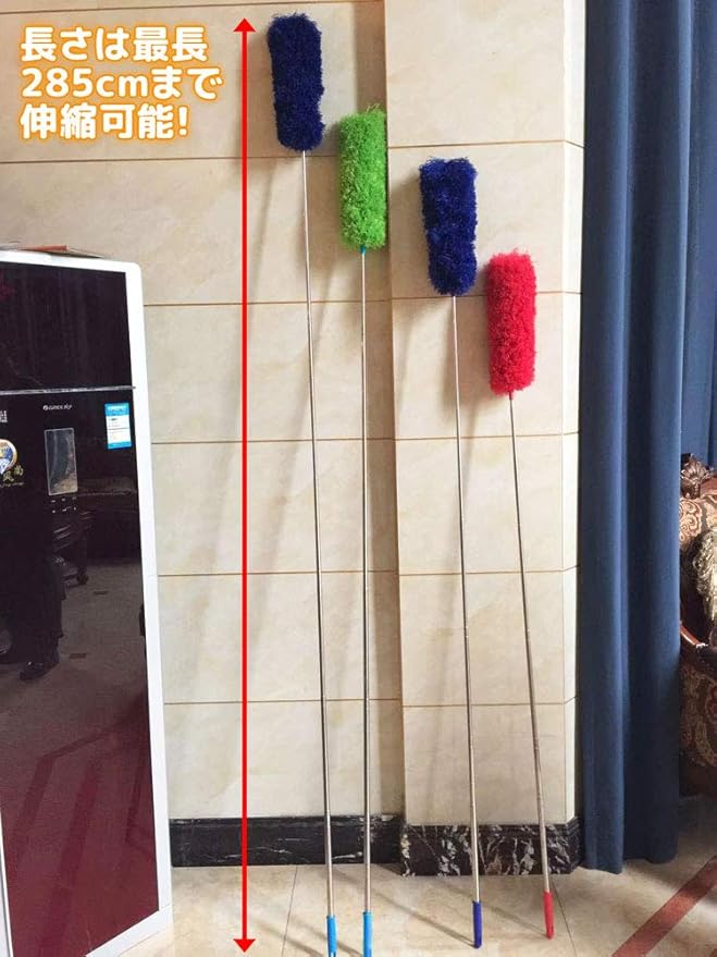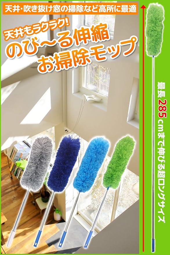 【大掃除の便利グッズ!超ロングモップ】最長285cm! 超ロングサイズになり、高い場所の掃除にぴったりな伸縮性あるマイクロファイバーモップです。吹き抜けなど、普段届かないような高い場所の掃除に最適!