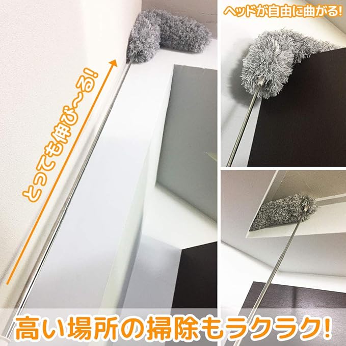 【届かない場所にも届く設計】ヘッド部分の芯はしっかりした針金のようになっているので、360度、好きな場所で自由自在に折り曲げることができます。窓掃除全般、天井と壁の繋ぎ目部分や、高所の窓のサッシ部分や換気扇などのファン、照明器具の裏側など、なかなか届きにくく掃除しにくい場所でも、下からさっとお掃除が可能! どこからでも曲げられるので、お掃除の幅が広がります! 業務用として社内や店舗の清掃にも、ご家庭での届かない場所のお掃除などにもOK。車の屋根を毛ばたき代わりにして掃除をしたりと、様々なシーンでお使いいただけます!
